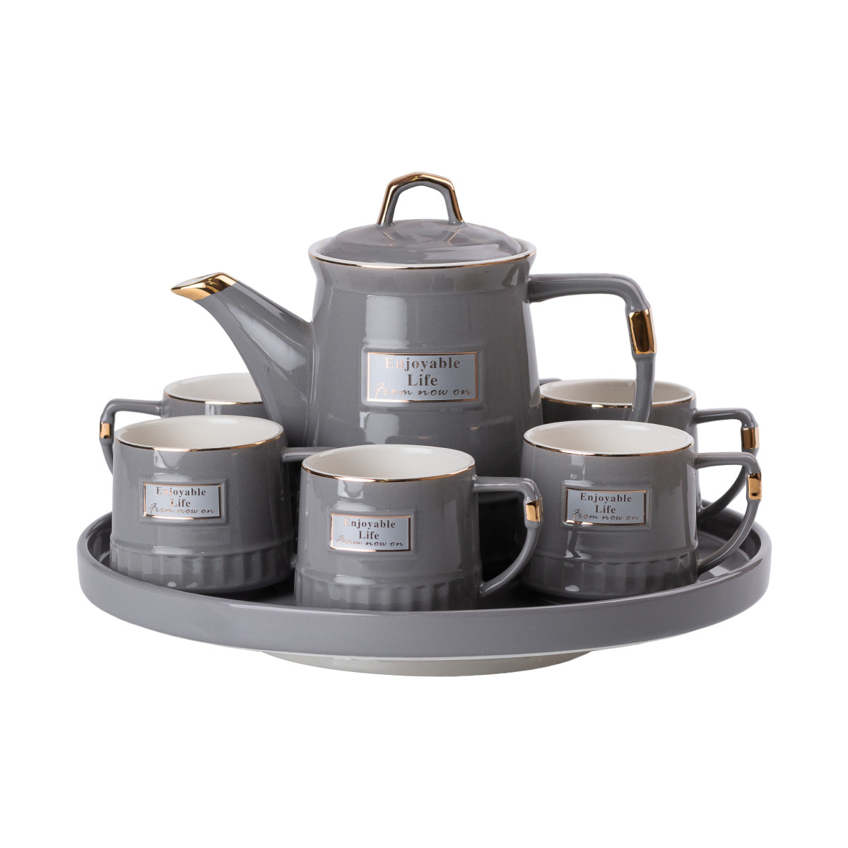 Чайний набір складається з 6 чашок, заварника та підставки. Набір ідеально підходить для чаю, кави або какао. Керамічні чашки та підставка стійкі до подряпин та деформації.